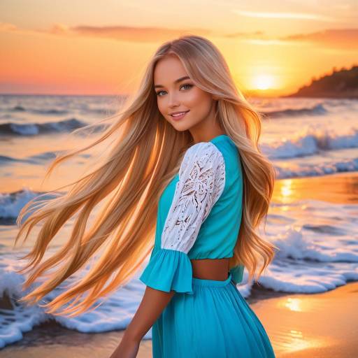 Wavy Shag hairstyle on woman, wearing elegant blouse, in beach, captured in fashion editorial style with golden hour lighting.
