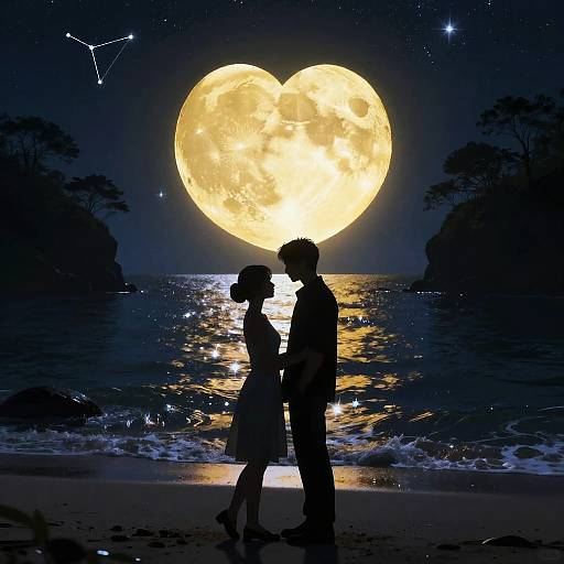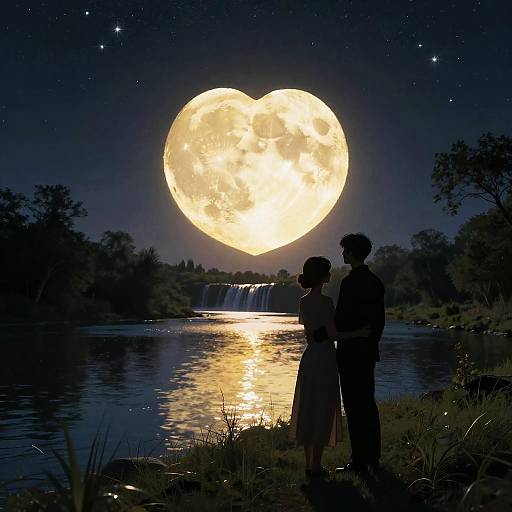 A photograph of a romantic silhouette against a bright, full moon. The couple stands close, the man with his arm around the woman, both dressed in dark, formal attire. The moon's glow illuminates their forms, while branches from a tree frame the right side. The sky is dark, creating a dramatic contrast with the moonlight.