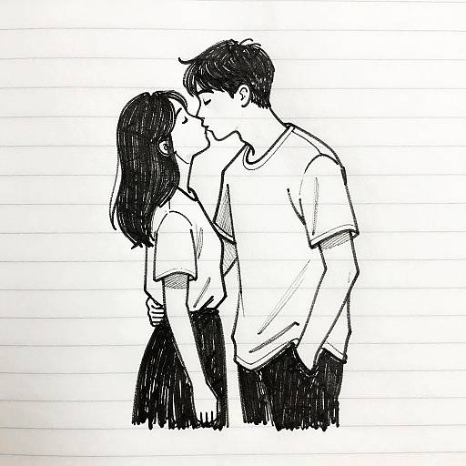 A black and white sketch on lined paper shows a romantic couple kissing. The guy, with short hair and a shirt, stands with his hands in his pockets. The girl, with long hair, wears a short dress and high heels, leaning in close. The sketch is rough but detailed, with visible pencil strokes and a casual, intimate vibe.