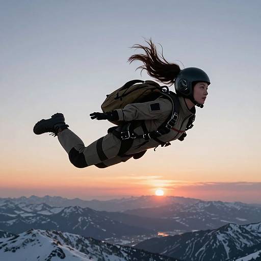 A dramatic action scene featuring a fearless skydiver in an expansive desert landscape, with a sunset sky reflecting off their goggles adding to the intrigue.