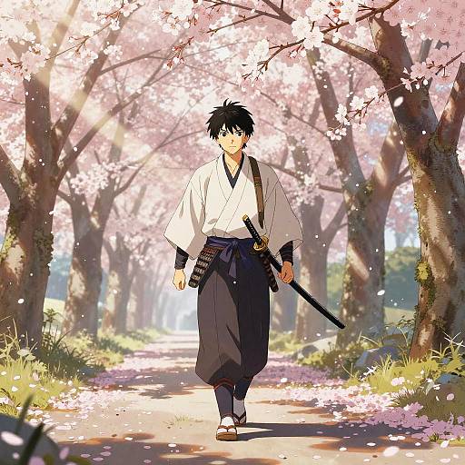 a determined samurai, holding a katana, dressed in traditional armor, standing against a serene cherry blossom garden, with a touch of humor and action in the anime style of Akira Toriyama.