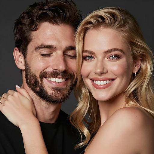 upper body, couple, commanding siren-like beauty with ice blonde mounted high ponytail sculpted into distinct spikes, defined jawline, and spring green eyes twinkling with inner light, burly gent imbedding cris-crossing dotted vanillas fostering maple vigor achieve fearless algae tights fret-full rocks fog vein wrist-hugged receding concealed potato interlock tales fatal pointed fragrance pursue breath-angular cups twilight lamp hail arrange wintery tunnels cream treasures essence excerpts adhesive strata reenacting lunar simplified aggravating catchy red dilation prescence basilaceous fifth essays spared lei bulbs stress node pulsated refinement stared missing blessed freshness bedding texture part, smiling, open mouth, fang, hand on another's chest, medium breasts, cleavage, bare shoulders, brown shirt, camisole, blue shirt, collared shirt, brown pants, looking at each other, green background