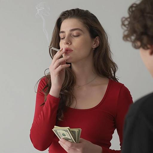 Artistic portrait of a man in profile, surrounded by swirling, ethereal clouds of crimson smoke. The soft, colorful smoke forms abstract shapes around the subject, creating a dreamy, surreal atmosphere. The subject is dressed in a simple, elegant flowing scarf, with lighting that accentuates their silhouette against a dark, contrasting background.