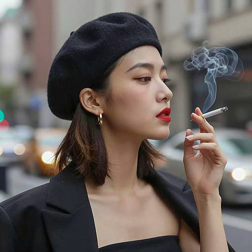Artistic portrait of a man in profile, surrounded by swirling, ethereal clouds of crimson smoke. The soft, colorful smoke forms abstract shapes around the subject, creating a dreamy, surreal atmosphere. The subject is dressed in a simple, elegant flowing scarf, with lighting that accentuates their silhouette against a dark, contrasting background.