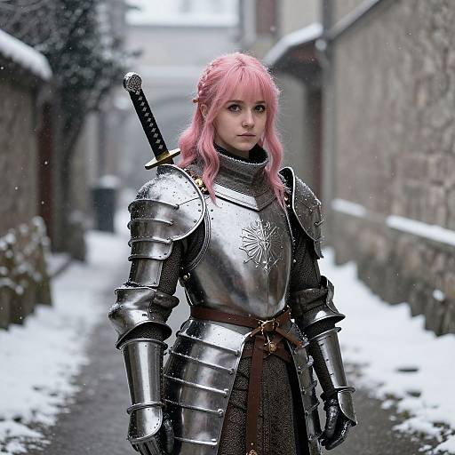 Warrior Braid hairstyle on young female knight, wearing silver chainmail with a crimson tabard, in snow-covered mountain pass, captured in fashion editorial style with cold, overcast daylight.