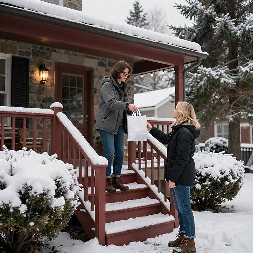 Massive weather-beaten stone fortress, quiet snow dusted mountain village, steep snow covered slopes, old rough cut limestone dwellings, vast glaciers and icy peaks, snowfall with swirling flurries, classic medieval stonework, crisp snowy surfaces on stones and paths, diffused pale winter daylight, highres, detailed, medieval, snowy, low-angle shot