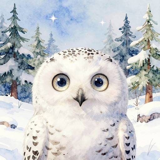 A highly detailed close-up of a wise snowy owl with soft down feathers catching frost, showcasing piercing amber eyes full of ancient knowledge, set against a frozen winter forest