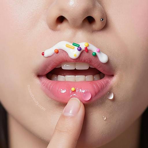 Close-up photo of a blonde woman with blue eyes, wavy hair, and pink lipstick. She has a small beauty mark on her right cheek. Her eyebrows are arched, and she is looking slightly to the left with a neutral expression. She wears small, ornate earrings on both ears. Her skin is fair and smooth. The background is blurred and dark.