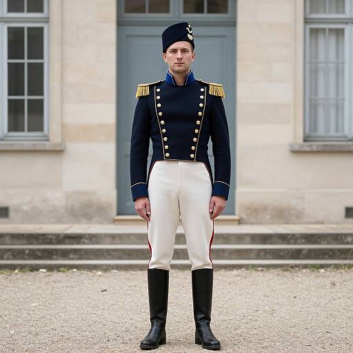 female soldier in brown uniform with green sleeves and a green hat. The soldier is standing on a cobblestone street with a crowd of people in the background.