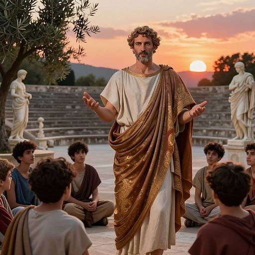 sharp, highly detailed, film from a 400 BC ancient Greece 8k movie, philosophers debating in an open agora, a respected philosopher and a passionate student, wearing correct era clothes, atmospheric lighting, in focus, reflective eyes, 35mm macro lens, live action, nice composition