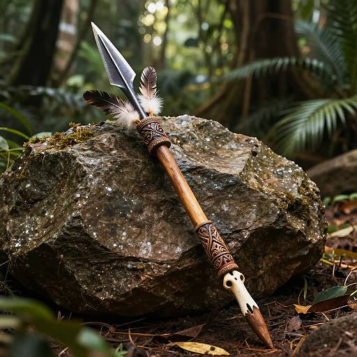 Muscular man with long brown hair, wearing a headband and necklace, holding a spear with a spiked handle. Shirtless, wearing fur loincloth and leather gloves. Rocky background, clear blue sky. Man looks determined, eyes focused forward. One person. Realistic photograph.