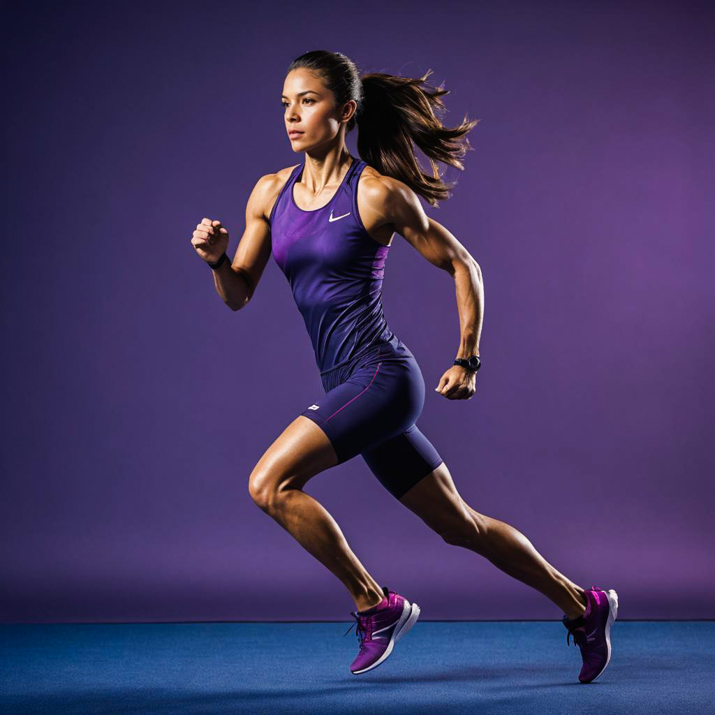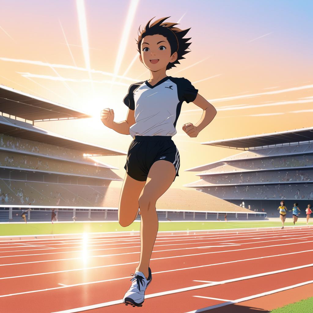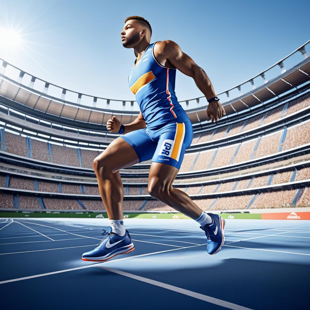 An athlete sprinting captured in dynamic speed, illuminated by vibrant sunset lighting that creates dramatic contrasts. The composition reflects Leni Riefenstahl's cinematic techniques, portraying agility and tenacity within a historical narrative.