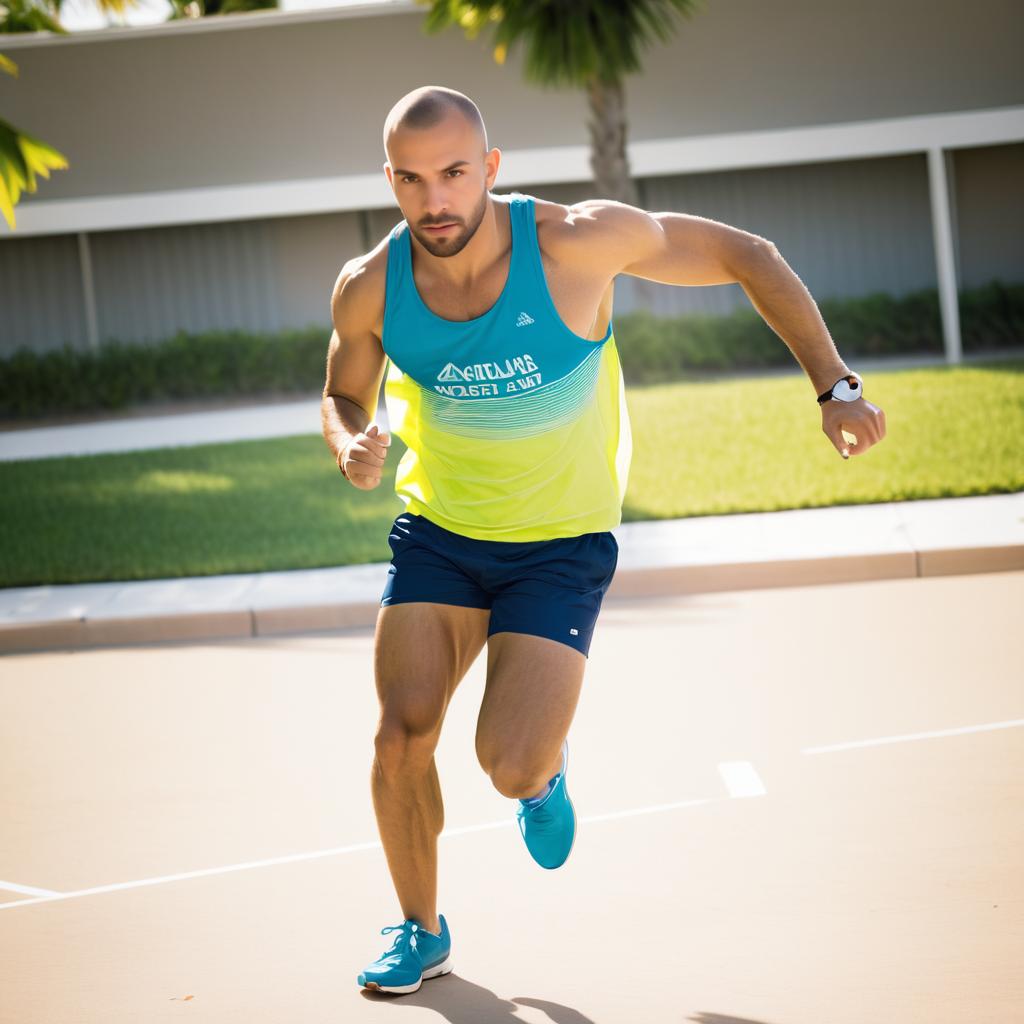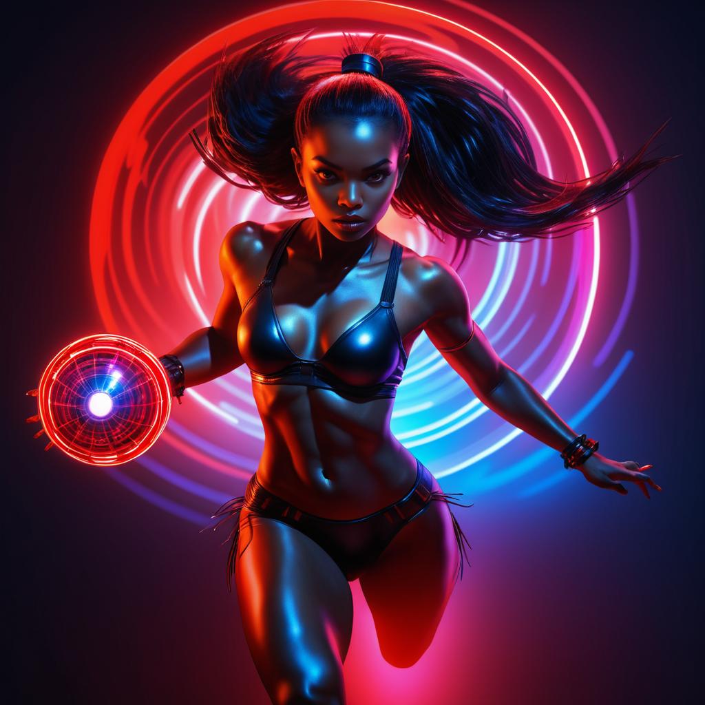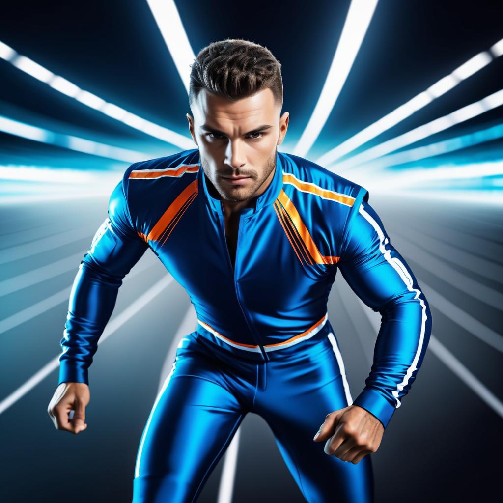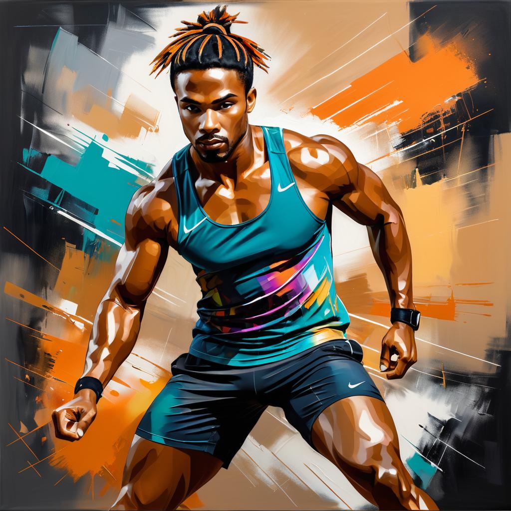 An athlete sprinting captured in dynamic speed, illuminated by vibrant sunset lighting that creates dramatic contrasts. The composition reflects Leni Riefenstahl's cinematic techniques, portraying agility and tenacity within a historical narrative.