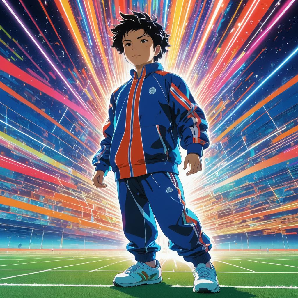 a spirited athlete, with intense focus and determination, wearing sporty gear and running shoes, sitting on a track field after a workout, drawn in the romantic and graceful style of Toshiko Ueda.