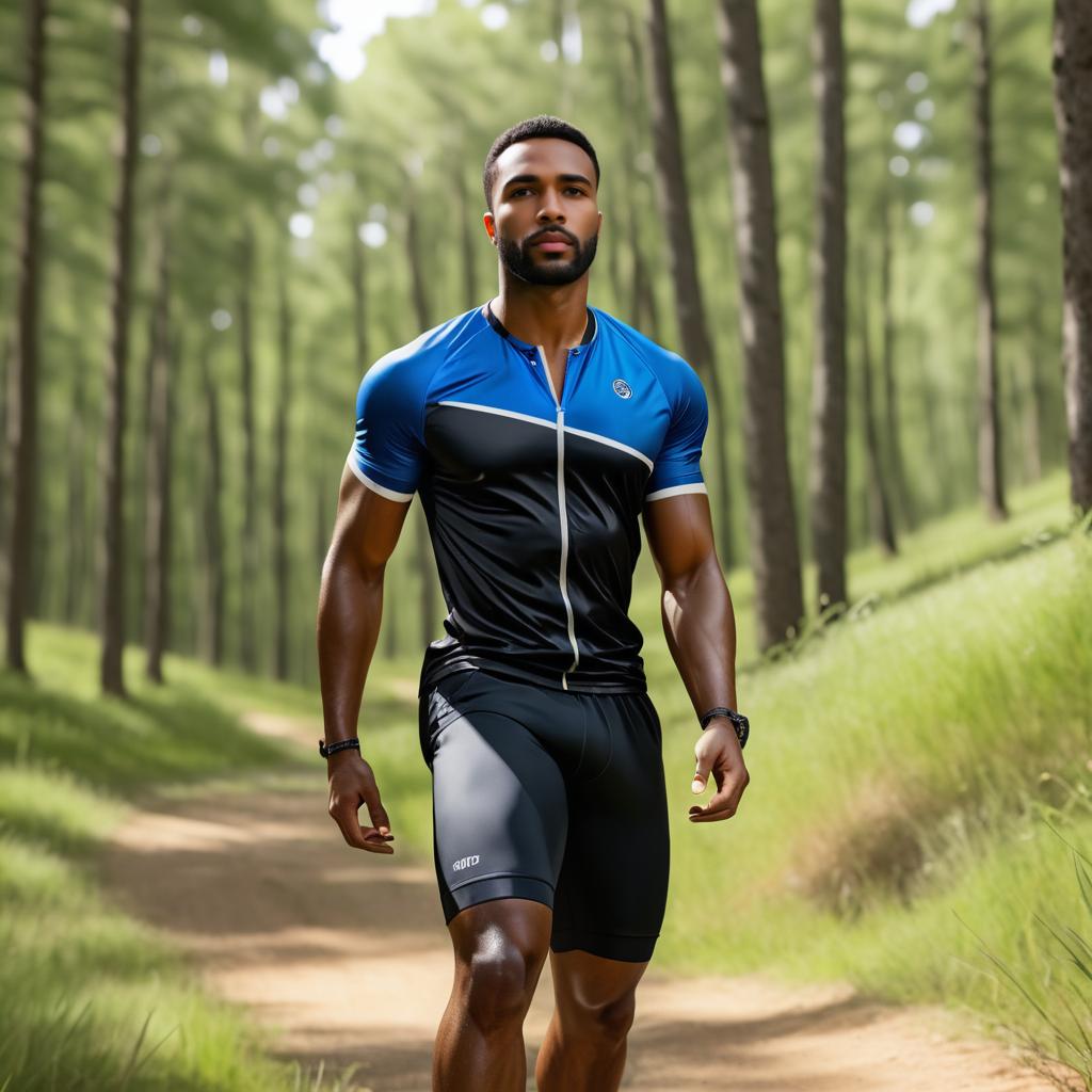 very wide shot, an athletic individual with closely cropped hair and piercing blue eyes, a sleek running outfit and trail shoes, running confidently on a trail, green background