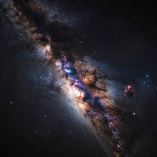 a stunning night sky filled with thousands of stars and a bright, colorful Milky Way nebula crossing the sky, glowing in shades of orange, pink, purple, and deep blue above a dark silhouette of mountain ridges, cosmic and ethereal atmosphere