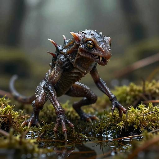 Concept art of a forest creature with iridescent scales and large green eyes, squatting and holding a branch, depicted with moss and fallen leaves, background: dark and mystical, atmospheric and eerie