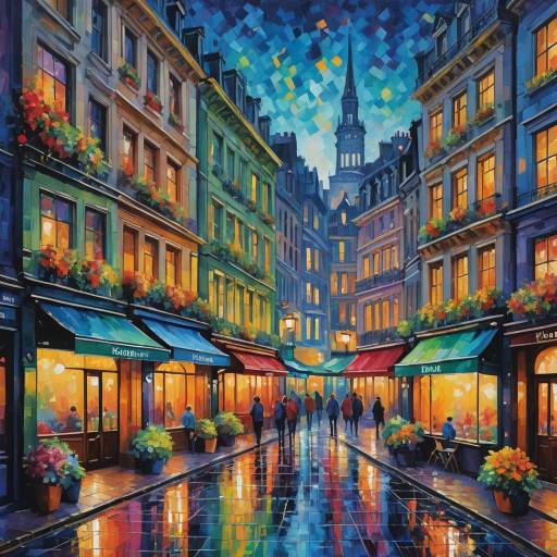 charming urban café 4K landscape, inspired by Art Deco, featuring a vibrant coffee shop with sleek lines and geometric patterns. In the foreground, a couple is enjoying their drinks at an outdoor table, surrounded by colorful flowers and bustling city life, creating a lively atmosphere.