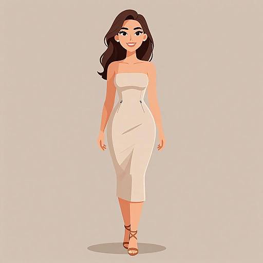 Woman, minimalist, camel-colored bodycon midi dress, spaghetti straps, v-neckline, fitted silhouette, knee-length, strappy black heels with cut-out detailing.