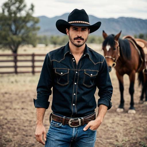 vintage rancher, slicked-back chestnut hair, muscular build, western theme outfit, rustic western style, plaid button-up, fringed leather jacket, straight-leg jeans, western boots, wide-brimmed hat, playful, bold, contemporary, Stone Wall studio background