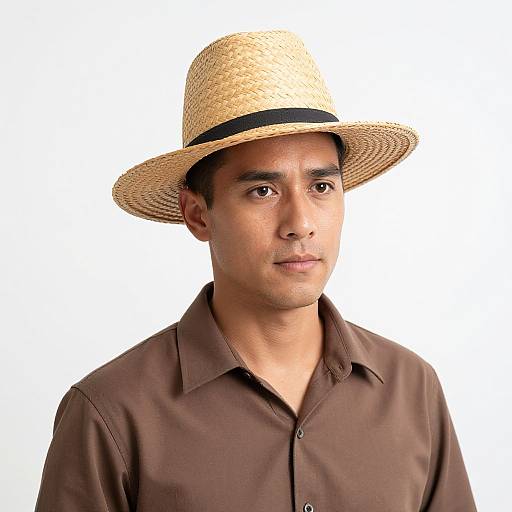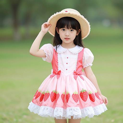 female wearing a straw hat with braids and a red and white striped shirt with a brown skirt.
