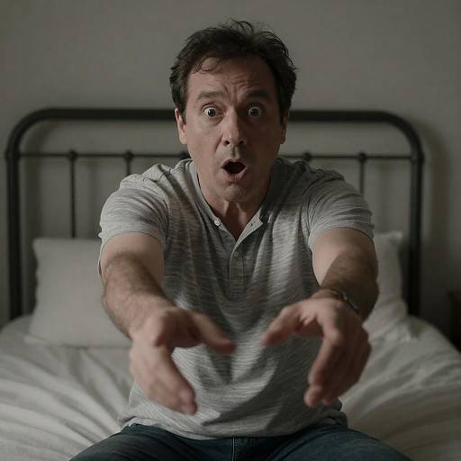 Blonde woman with wavy hair, wearing a black and white striped top, sitting on a bed, looking to the side. Bedroom background with a wooden headboard, floral painting, and lamp. White door slightly open in the background. One striped pillow on the bed. Soft lighting. Casual, thoughtful expression. One person.