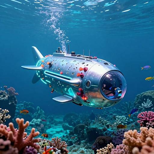 USN submarine cruising underwater, surrounded by marine life and deep blue tones, sleek and stealthy design emphasized, ambient light filtering from above, high detail and realism, cinematic underwater perspective with bubbles and particles