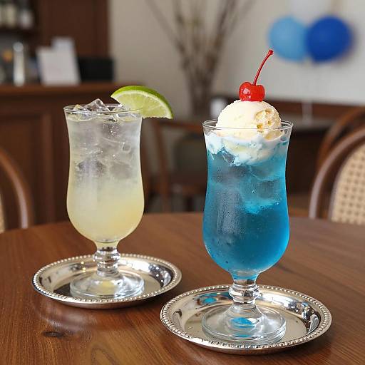 Two colorful drinks in glass cups with silver bases on a wooden table. The front drink is blue with ice cubes, topped with a white scoop of ice cream, pink rose petals, and a red cherry. The back drink is purple with ice cubes, topped with a white scoop of ice cream, pink rose petals, and a red cherry. Both drinks have green leaves on top.