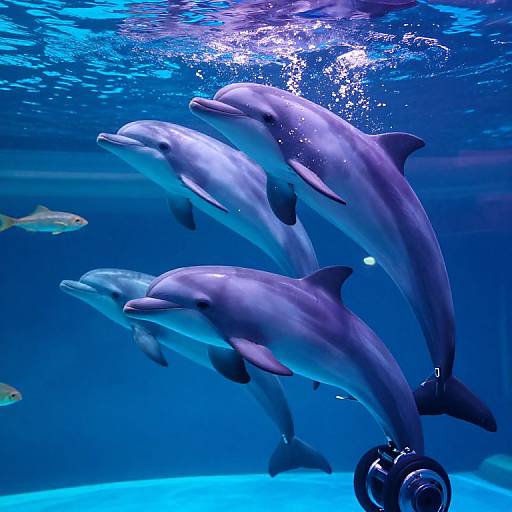 graceful dolphin emerging from the fabric of the ocean waves, its body glistening in the sunlight, as if leaping through the water. fluid motion, shades of blue and turquoise