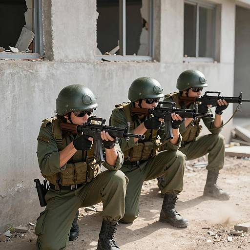 four soldiers in a dimly lit, industrial room. They wear camo uniforms, helmets, and tactical gear. All have serious expressions. Soldier on left grips a control panel, others stand close. Bright green light from left, background includes equipment and screens. Soldier in center wears headset. Soldiers on right and far right hold rifles.