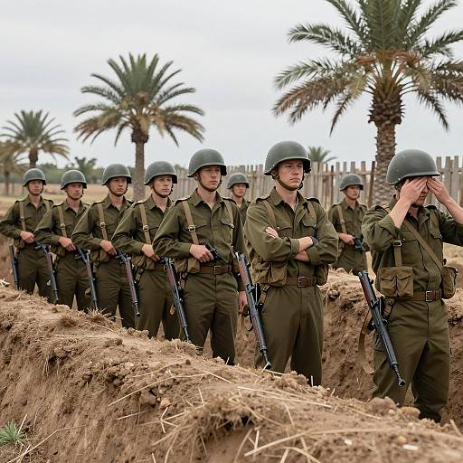 Three soldiers in dark tactical gear with helmets and vests, crouching and firing guns, in a rainy, blue-lit, industrial area. Large machinery and a truck in the background. One soldier leans against a wall on the right. Water and debris on the ground. Soldiers in mid-action, with intense, focused expressions.