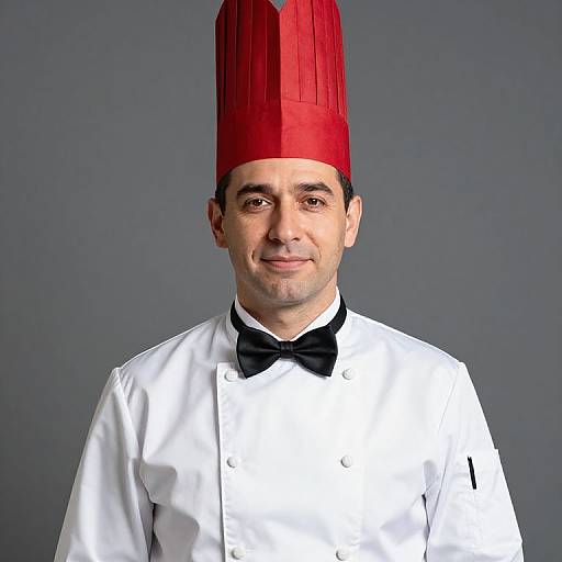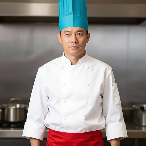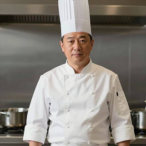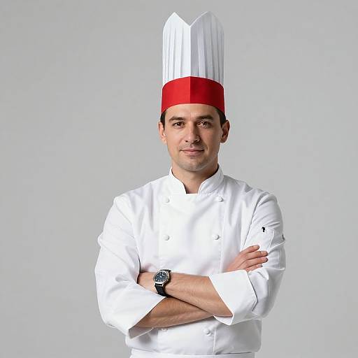 An acclaimed chef dressed in a tailored chef coat over trendy casual wear, posing against a high-end restaurant kitchen, featuring a chef's hat and precision kitchen tools accent.