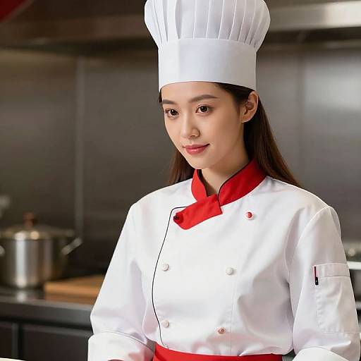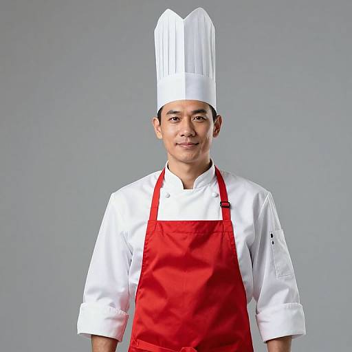 a skilled chef, wearing a classic white chef's uniform with a tall hat, working on a gourmet dish, in a bustling kitchen filled with fresh ingredients, depicted in the detailed and lighthearted anime style of Kosuke Fujishima.
