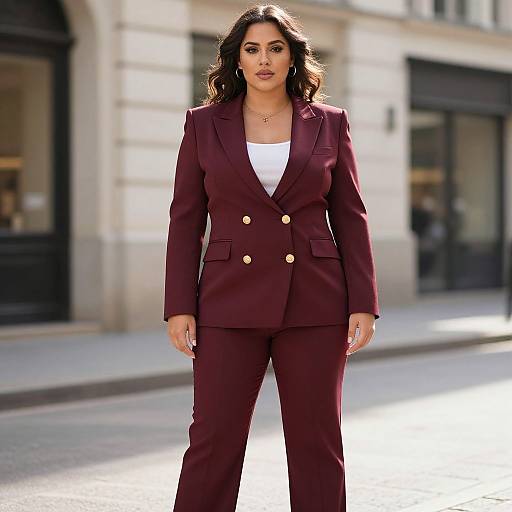 woman wearing sleeveless tailored wide-leg jumpsuit with vertical pinstripes, wrap-front bodice and matching waist tie belt in burgundy with blush pinstripes on petite woman with softly curled bob and natural makeup posed standing with legs crossed at the ankles and hands in pockets in sunlit wall with leafy shadows cast across the surface, single warm beam of light across upper body, cinematic editorial fashion photography, high resolution, ultra-detailed