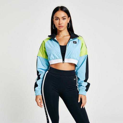 Woman, modern edgy, ombre teal high-neck crop top with mesh paneling, circular cut-outs at the hem, rooftop garden with city skyline at dawn