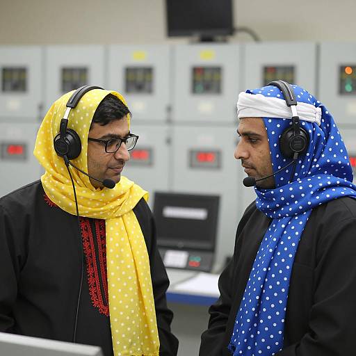Two men in a dimly lit room with a large control panel. Man on left, white shirt, back to camera. Man on right, light pink shirt, looking at control panel. Control panel with lights, geometric symbols, and stacked glass lamps. Silhouetted audience in foreground. Background: shelves with electronics and equipment.