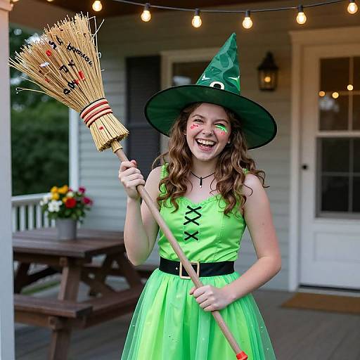 teenage female, Hourglass shaped, Curly Lob, halloween outfit, witchy green velvet dress with crescent moon accessories, pointed black hat with silver trim, Mystical forest ambiance