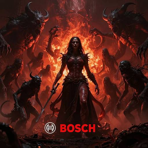 Painting of a woman with stone-like skin, slim, tall, dressed in black with a scarf around her neck, set in a nighttime forest scene in the style of Hieronymus Bosch.