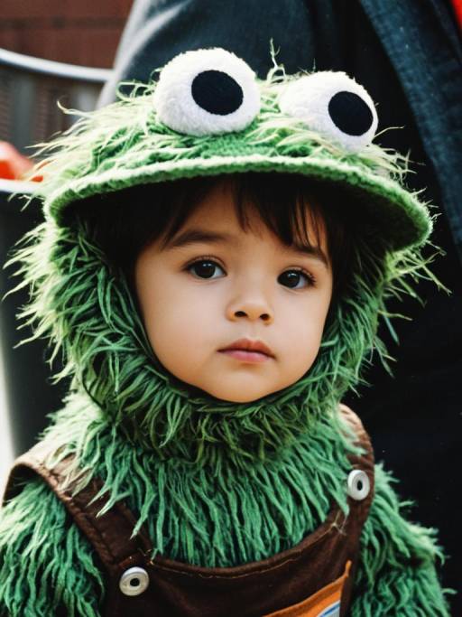 toddler caterpillar costume,solo, barefoot, male focus, 1boy, outdoors, kigurumi, blurry, cosplay, realistic, looking at viewer, animal costume, costume, blurry background, hood, nature, full body