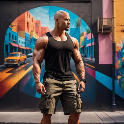 dynamic athlete, wearing a vibrant tank top, with muscular arms, bold eyeliner