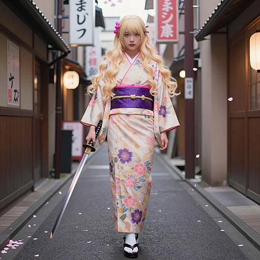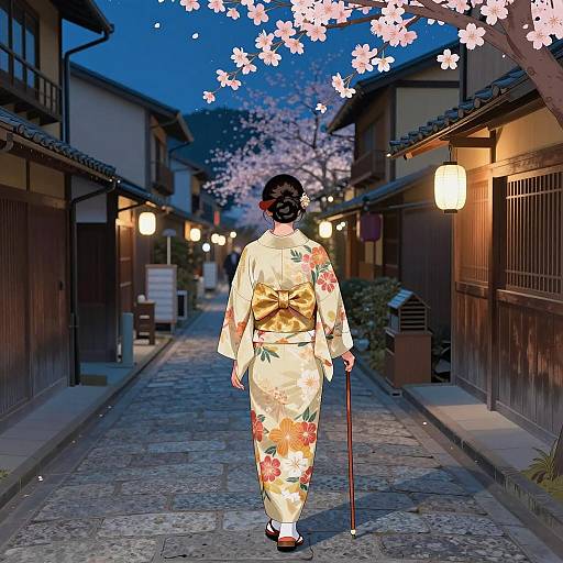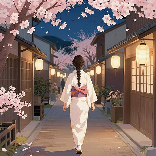Isometric low-angle shot, at twilight, on a bustling Tokyo street featuring a charming old-style tea house with arcades, decorated with cherry blossoms. The sunset sky is ablaze, creating a romantic, slightly sensual ambiance.