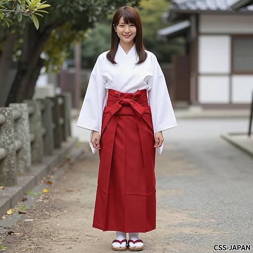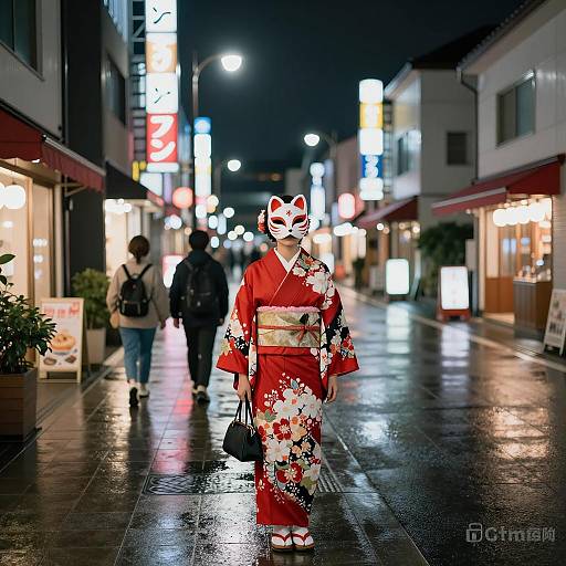 Night street photograph. Japanese woman in center, wearing red and white floral kimono, black hakama with floral pattern, and red fox mask. She stands on a wet sidewalk, holding a black bag. Two other people in background. Neon signs and illuminated shop fronts line the street. Street lights and reflections create a glossy surface. Two-storey buildings with red roofs on both sides. Watermark in bottom right corner.