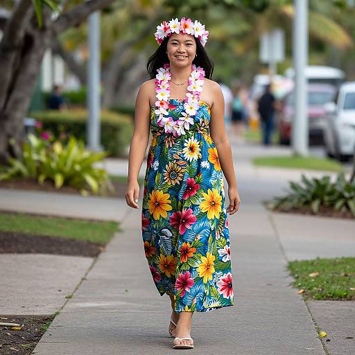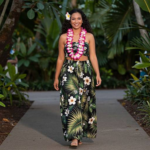 lively Hawaiian hula performer captured mid-spin, wearing flowing floral muumuu and lei garlands, swirling fabric and intense expression, beachfront luau scene with palm trees, tiki torches, and sunset glow; warm festival ambiance, textured cobblestones, festive banners, confetti drifting, volumetric sunlight, subtle motion blur, high detail, soft bokeh, dramatic shadows, rich surface textures, storytelling composition, lively yet elegant atmosphere