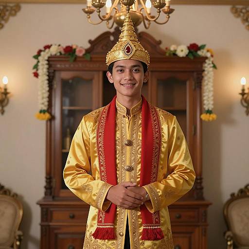 folk dance clothes, photograph of young woman, traditional ethnic dress, standing, front view, detailed embroidery, red and orange colors, short sleeves, high waist skirt, flower crown, green necklace, red and green bracelets, wooden background, daytime, soft light, ethnic beauty, traditional attire, serious expression, realistic style, high detail, cultural attire, ethnic jewelry, traditional headgear
