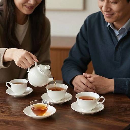 andytea cozy tea shop interior bathed in warm golden light, steaming teacups on rustic wooden tables, vintage teapots and delicate china, soft pastel color palette, inviting atmosphere, calm and serene mood