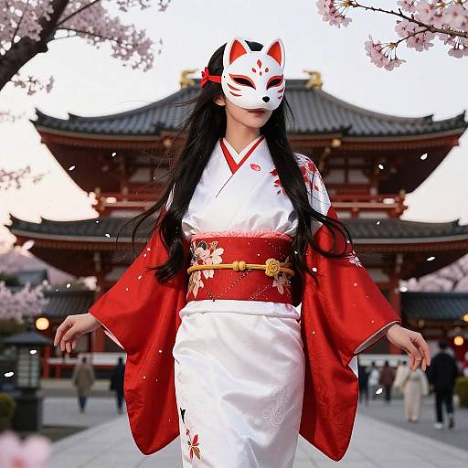 Isometric low-angle shot, at twilight, on a bustling Tokyo street featuring a charming old-style tea house with arcades, decorated with cherry blossoms. The sunset sky is ablaze, creating a romantic, slightly sensual ambiance.