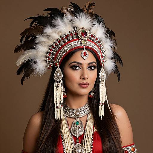 indian tribe costume,1girl, solo, jewelry, headdress, necklace, earrings, long hair, black hair, realistic, braid, feathers, looking at viewer, native american, bare shoulders, lips, upper body