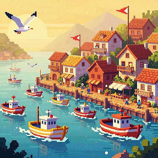 Pixel art quaint seaside fishing village with colorful boats and bustling docks set in golden hour harbor scene with gently rippling water and seagulls, rendered in 16-bit coastal theme pixel art, soft shading, gentle animations including water and flags; saturated limited palette, tasteful dithering, soft bloom highlights, animated flags and water, tiny NPC sprites on balconies, atmospheric particles like birds or drifting snow, nostalgic cartridge mood, epic yet whimsical fantasy tone.