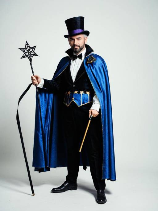 Man in Magician Costume, full-body cosplay photo with cape and wand