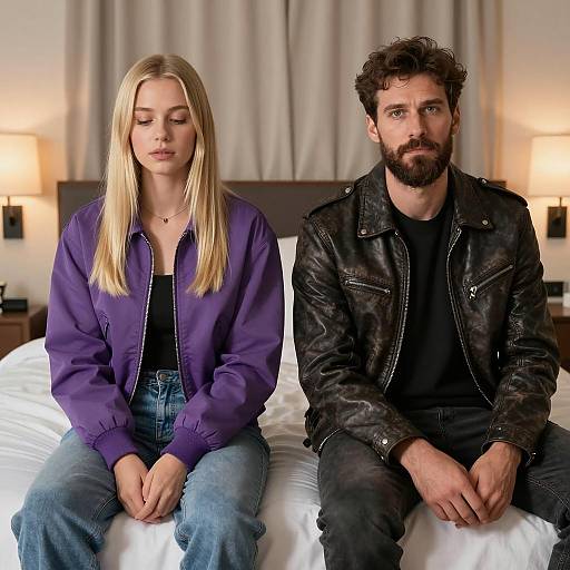multiple girls, 2girls, lying on bed, yuri romance, wearing pajamas and nightgown, relaxed atmosphere, intricate sleeve design, dark-skinned female with red hair and single hair bun, blue-eyed blonde smiling, looking at another, grin, blush, gentle bedside lamp providing warmth, vintage styled master bedroom, detailed attire, playful banter creating laughter, ear piercing, earrings, nails painted, intimate setting